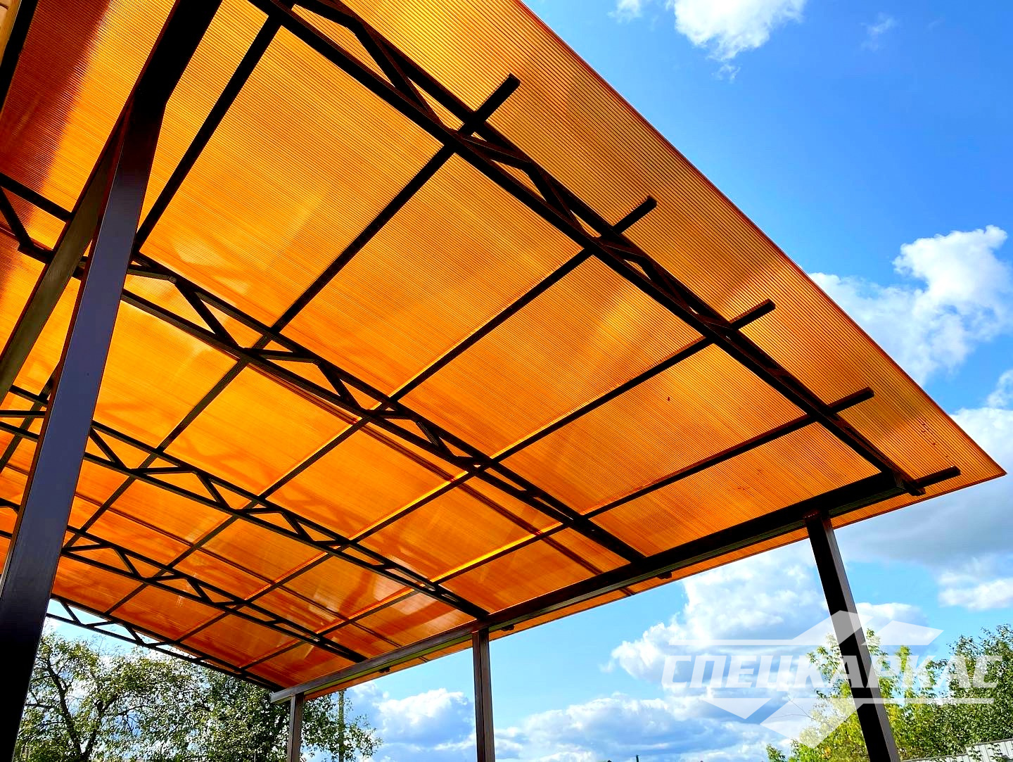 - Определить подходящий оттенок для материала кровли. Цвета в цифровых проектах могут серьезно отличаться от реальных, поэтому фотографии навесов металлических будут более достоверным источником информации. А сделать окончательный выбор помогут образцы материалов, которые предоставит наш специалист во время выезда на замер. Они будут особенно полезны, если вести речь про навесы из поликарбоната, у которых от колера кровельного материала помимо внешнего вида зависит то, сколько света будет пропускать крыша.